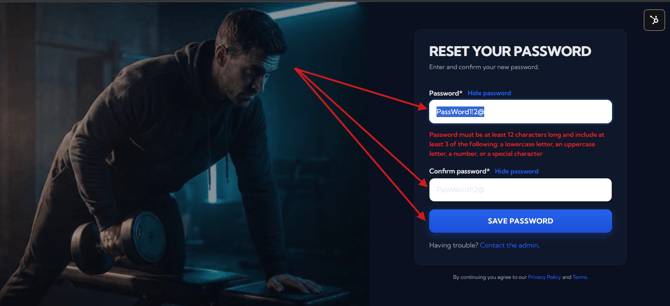 - Click on “Reset Password” to be routed to the password reset page. Your new password must be at least 12 characters long and include at least 3 of the following: a lowercase letter, an uppercase letter, a number, or a special character. You can use a format like PassWord1!2@, then click “Save Password” to complete the process.