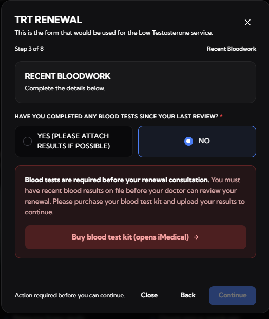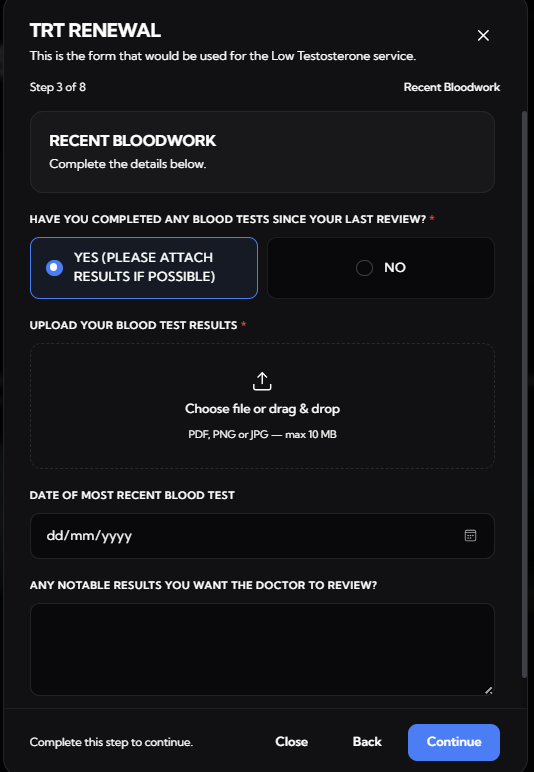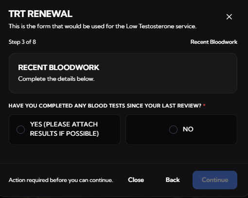 “Blood test results required: Please upload your most recent blood test results to continue your treatment”