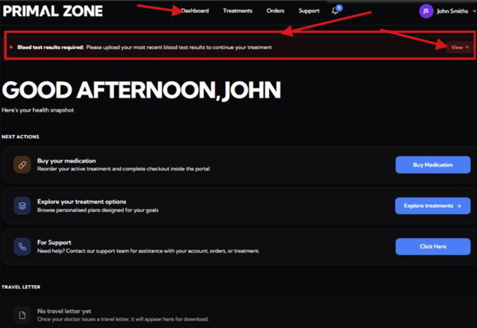 “Blood test results required: Please upload your most recent blood test results to continue your treatment”