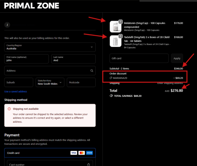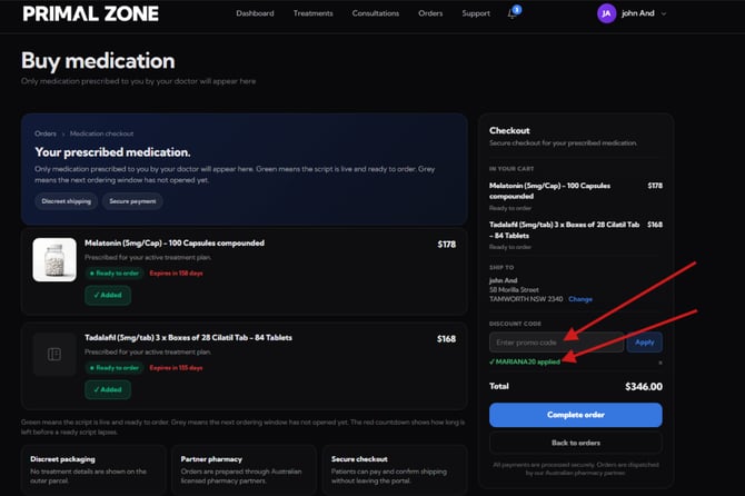 You can apply a discount code when purchasing your prescribed medication through the Primal Zone patient portal. Follow the steps below to ensure your discount is applied correctly.
