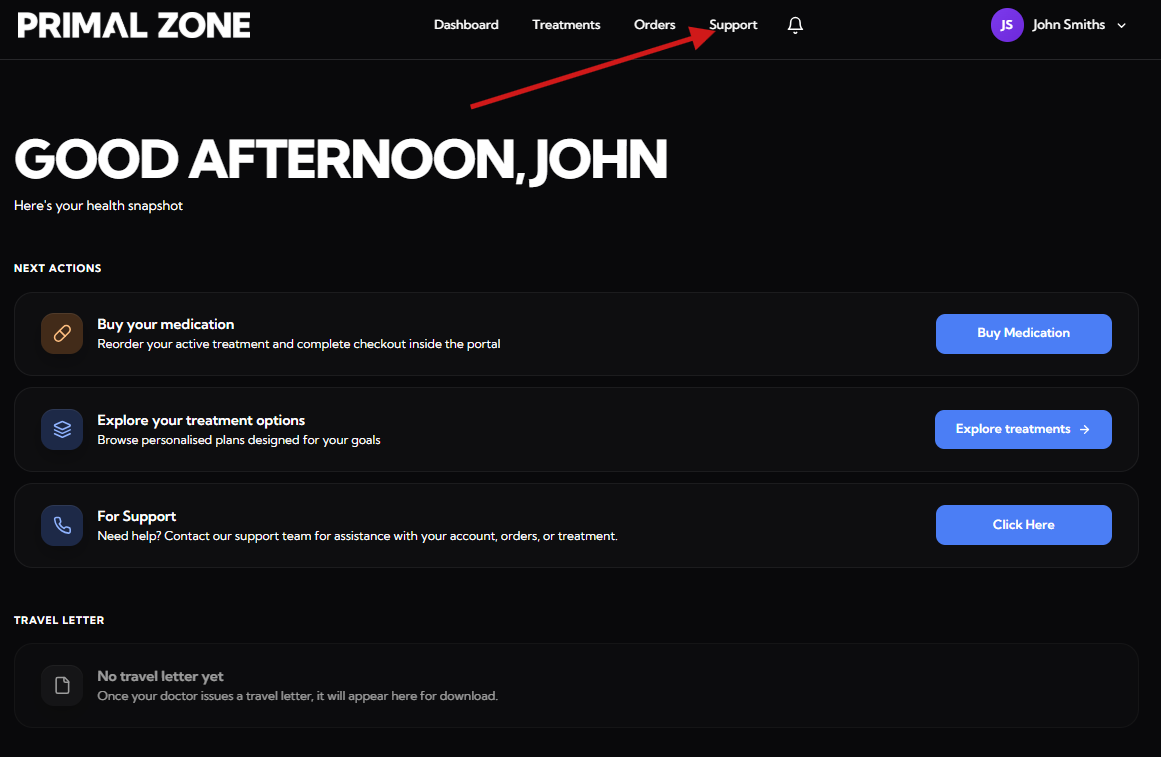- Click the “Support” tab at the top of the portal