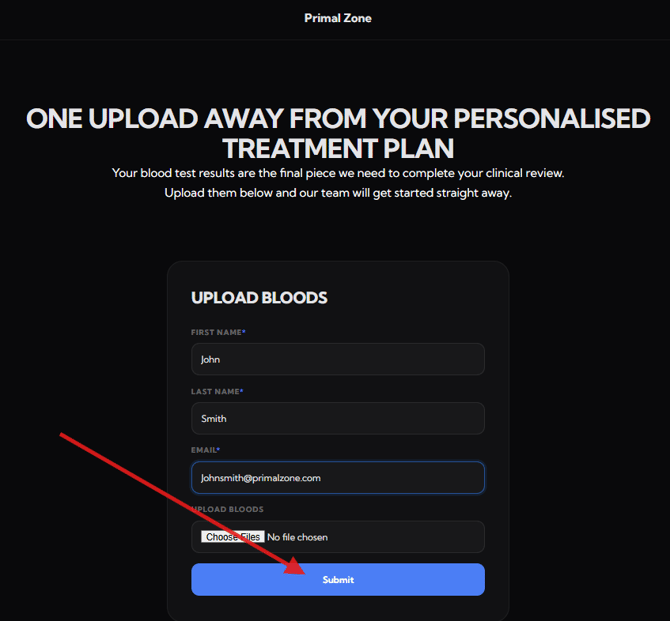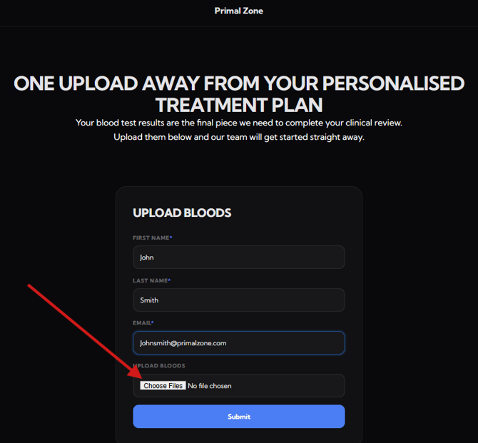 To proceed with your treatment plan, you’ll need to upload your blood test results. This can be done quickly using the secure upload link provided to you.