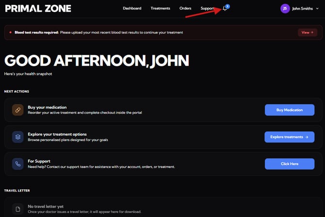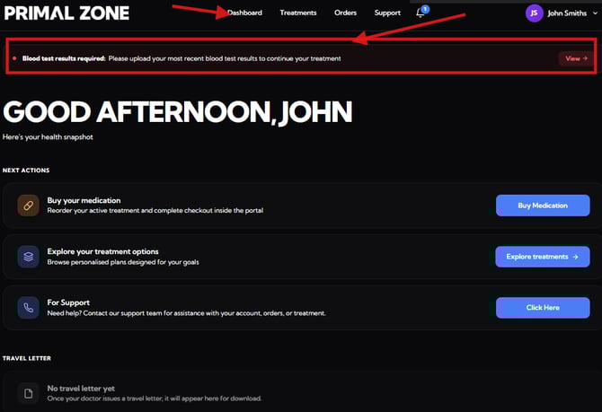 “Blood test results required: Please upload your most recent blood test results to continue your treatment”